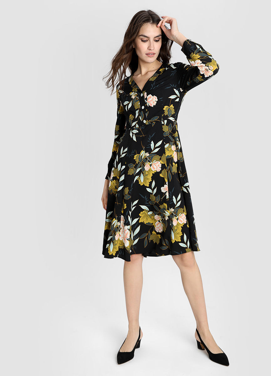 Подойдут платья с V-вырезом, завышенной талией, модели с запахом, расклешённые книзу