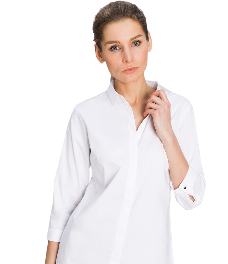Белая классическая рубашка ‒ 100% офисный стиль. В комплекте с джинсами она смотрится не так, как со строгим костюмом: не только создаёт деловой образ, но также подчёркивает достоинства фигуры.